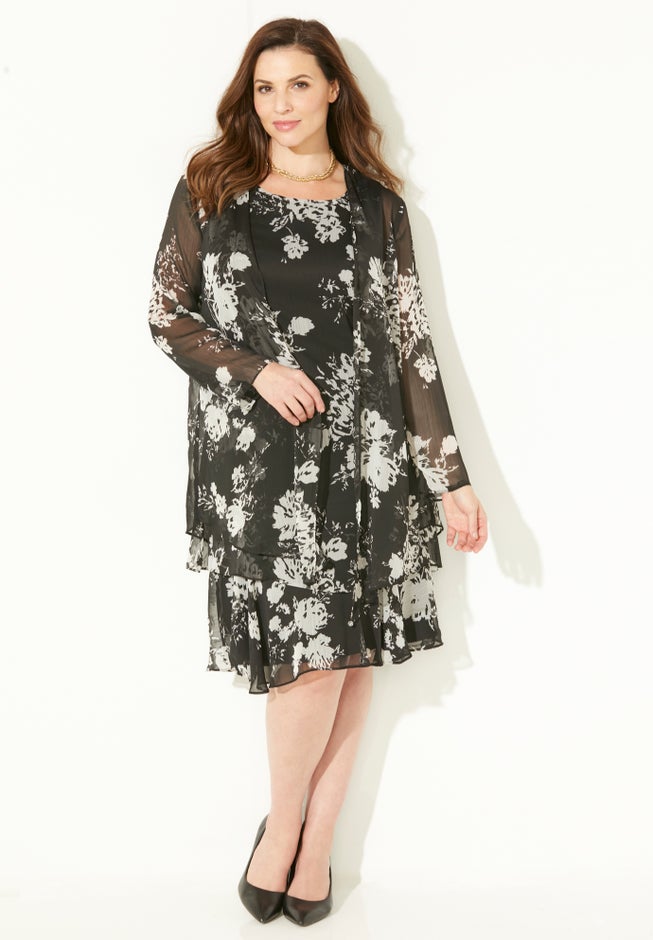 Crafted from soft, fluid georgette fabric, this easy jacket dress is designed to float and swirl as you cross the room. Soft and fluid with sheer overlay and sleeves. Bold blooms stand out on this classic silhouette that drapes gracefully over your curves.