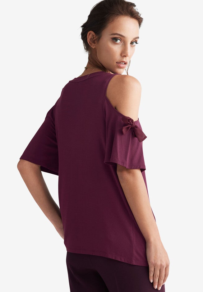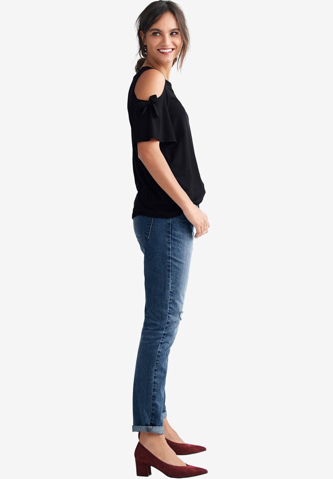 A chiffon self-tie bow detail at the cut-out sleeve, makes this drapey top standout. Pair yours with our skinny jeans & floral slides.