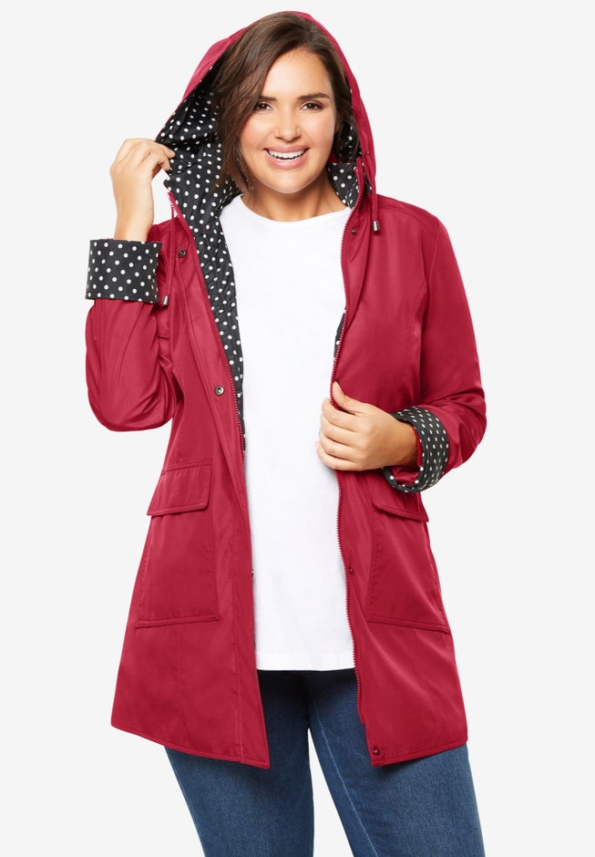 Our plus size rain jacket is perfect for multi-season comfort. The fun dot trim will make you the best dressed even in the rain.