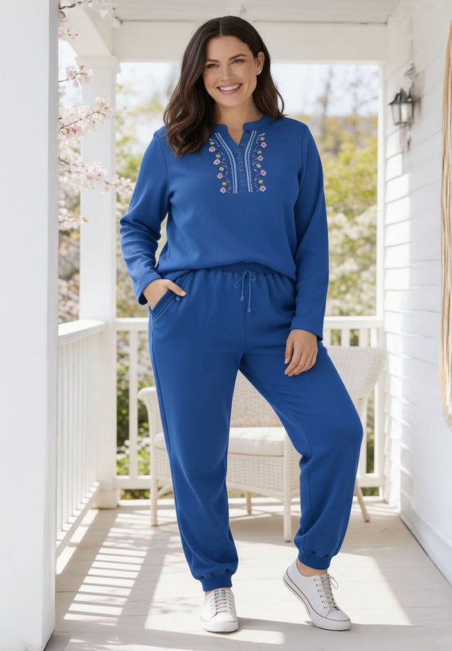 This comfortable thermal is lightweight and is perfect for all year around. This softly textured waffle knit fabric is sure to keep you comfortable. V-neck Henley front with metallic buttons and floral embroidery for a stunning effect. Soft and snuggly, this feminine style will feel good every time you put it on.