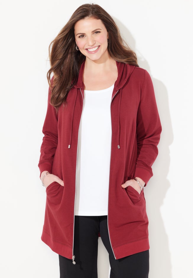 FIT: Relaxed and easy with added length for comfort and coverage. Long sleeves. Drawstring hood. Zip front. Angled zip pockets.