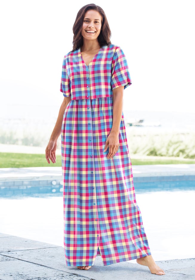 Made in lightweight seersucker fabric for warmer weather, this lounge dress looks great and keeps you cool. A snap-button front and shirred empire waist give the look of a casual dress that makes this perfect for wearing around the house.
