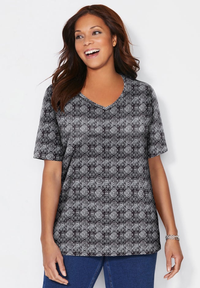 FIT: Relaxed and feminine with a comfortable V-neckline and short sleeves.