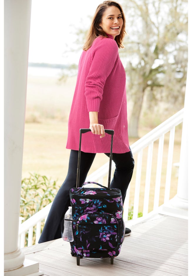 Take a weekend trip in functional style with this trolley bag! Multiple compartments with an easy pull and carry handle. Side net pockets to keep your water bottles or thermos secured. Easy to stow as a carry-on or to pack away for a road trip!