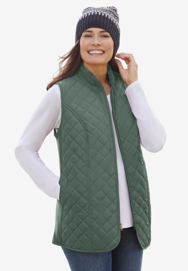 Bring color, texture and warmth to your outfit by layering on this cozy vest with diamond quilting. Rib knit sides provide flexible comfort, while a front zip and stand collar create an extra element of warmth. Handy pockets hold your essentials and keep your hands cozy.